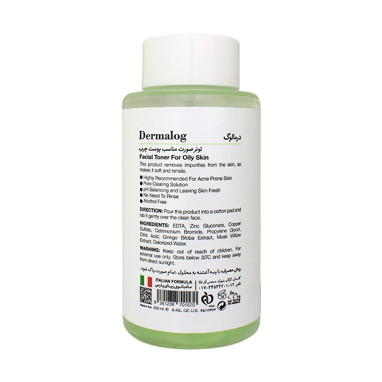 تونر یکی از انواع محصولات مهم در روتین پوستی است که بایستی نسبت به نوع پوست انتخاب شود. برند ایرانی درمالوگ تونری را به تولید رسانده است که برای پوست مختلط، چرب و دارای جوش مناسب بوده و سبب پاک کردن انواع آلودگی از سطح پوست میشود. این تونر PH سازگار با پوست را داشته و از ترکیبات مضری همچون الکل در آن استفاده نشده است. در ترکیبات این محصول از عصارههای بیدمشک و کهندار نیز استفاده شده است که چربی پوست را کنترل مینمایند و منافذ پوست را به صورت عمقی پاکسازی میکنند. این تونر در حجم 250 میلیلیتر برای استفاده روزانه در روتین پوست چرب انتخاب مناسبی است.